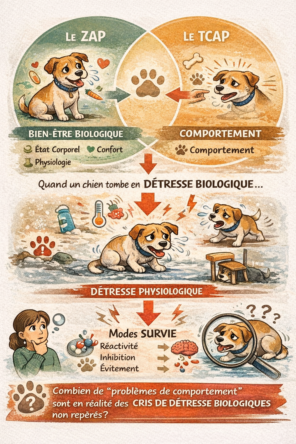 When a dog shifts into biological distress, they can quickly enter physiological distress; and, if this load exceeds their adaptive capacity, we often observe the activation of survival modes (reactivity, inhibition, avoidance along with survival modes triggered by biology), which then complicate learning and collaboration.