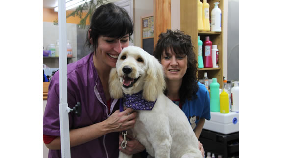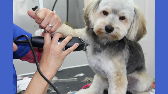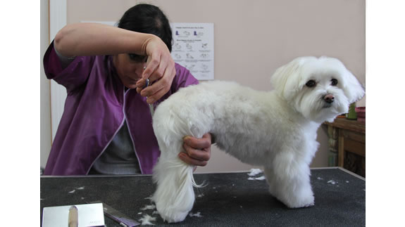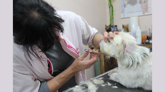 Josée taille les pattes de Maggy aux ciseaux